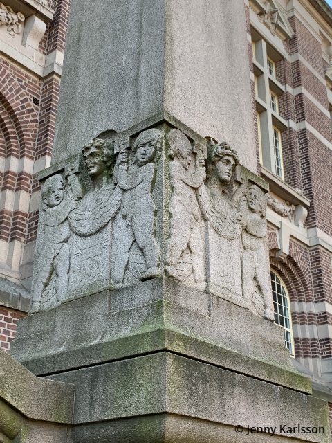 Den ursprungliga huvudentrén mot torget är monumental i sin utformning. En rak naturstenstrappa med två armar flankeras av dekorhuggna koppartäckta gatlampor.
