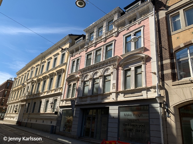 Hade jag haft koll på att huset var byggnadsminne i samband med mitt besök i Norrköping sommaren 2022 så hade jag nog spanat in det lite närmare. Men, det var faktiskt det rosa huset, till höger i bilden, som fångade mitt intresse och som jag fotade helt spontant, då jag tyckte det var så fint.