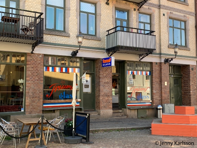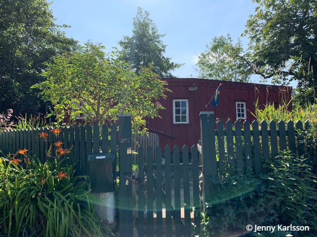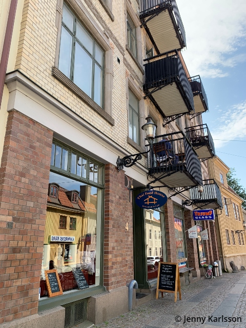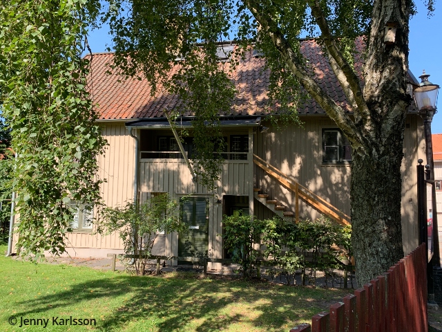 Jeduerska huset, sammanbyggt med Dahlströmska huset som jag skrev om i mitt förra inlägg, består av ett äldre gatuhus, uppfört ca 1790-1810 och en yngre gårdsflygel/magasinsbyggnad, från 1890-talet. Byggnaden ut mot gatan har liksom Dahlströmska huset en förträdgård mot Allmänna vägen. I anslutning till huset finns en större trädgård, den s.k. Jedeurska trädgården, som ansluter mot den Gathenhielmska trädgården.
