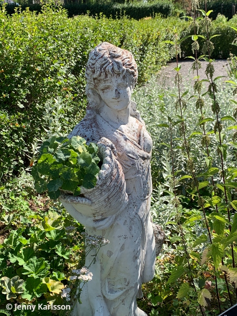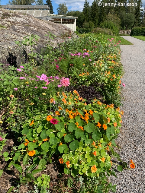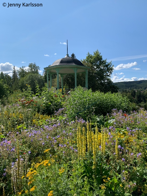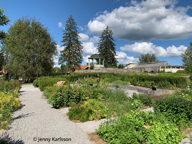 Trägårdsparken som jag nämnt tidigare, breder ut sig på andra sidan kullen med det gula lusthuset och växthuset, söder om den kulturminnesmärkta gården med sina byggnader. I trädgårdsparken kan man vandra bland ekologiska grönsaksodlingar, praktfulla rabatter med perenner och gammaldags växter, sommarblommor för ögats fröjd och en örtagård för kropp och själ. Utanför häckarna finns skogsgläntorna där man år för år röjer fram nya stigar och strövområden.