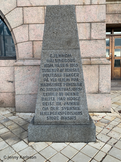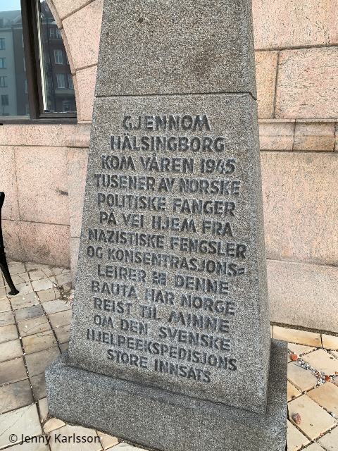 Texten på den norska stenen lyder: ”Gjennom Hälsingborg kom våren 1945 tusener af norske politiske fanger på vei hjem fra nazistiske konsentrationsleirer. Denna bauta har Norge reist til minne om den svenske hjelpeekspedisjons innsats.”