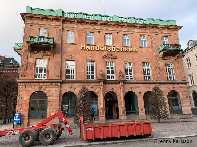 Det här vackra bankhuset vid Stortorget i Helsingborg är uppfört i en romerskinspirerad renässans. Det uppförds mellan åren 1902 och 1904 av Bankaktiebolaget Södra Sverige efter ritningar av Alfred Hellerström (1863-1931), som även ritat bl.a. rådhuset här i Helsingborg.