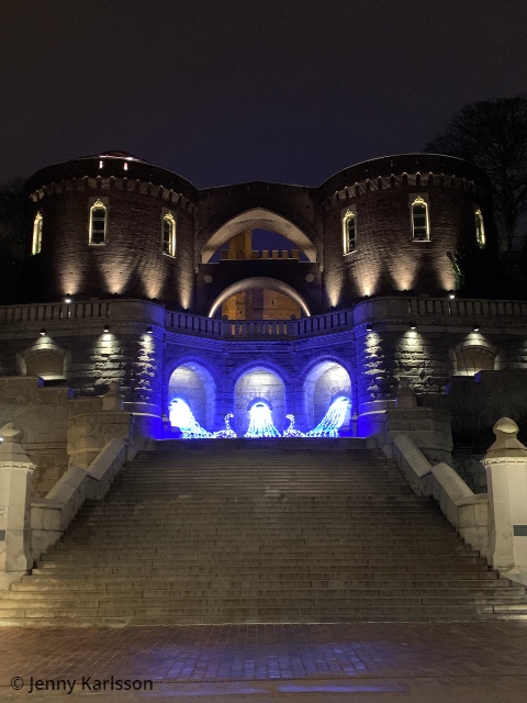 Den undre delen av trapporna har drag av nybarock och är uppförd i Uddevallagranit. Den övre delen har ett medeltida uttryck och är uppfört i Helsingborgstegel. Trappfoten flankeras av två valv, ett blinderat i söder och ett i norr som utgör en tunnel fram till en hiss som leder upp till det norra tornet.