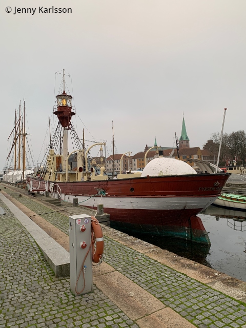 ”Gedser rev” som sedan 2018 ligger i kulturhamnen i Helsingör, har tjänstgjort i danska farvatten som Fyrskib No. XVII. Det saknade motor och släpades på plats.