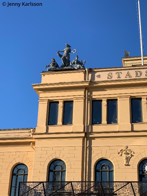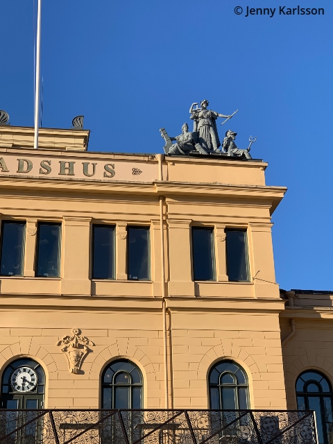 Utvändigt accentuerades storslagenheten i byggnaden med genom att de två skulpturgrupperna av C J Dyfverman, som kröner de bägge mittrisaliterna, beställda av Bugge 1890. Mot söder skapades en pendang till huvudfasaden, där mittpartiets uppbyggnad med stadshussalongens stora galafönster livar upp byggnadens byggnadens baksida.
