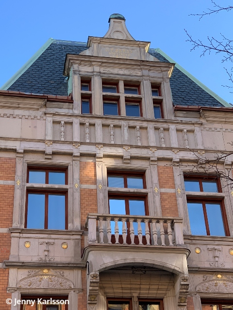 Mot Thulegatan finns två fält i södra delen av huset föreställande moderna tiden (1890-tal) genom representationen av den nya elkraften med glödlampor och den nya gastekniken. Thulegatans fasad är i lägre grad försedd med dekorationer, utförandet är inte lika påkostat.