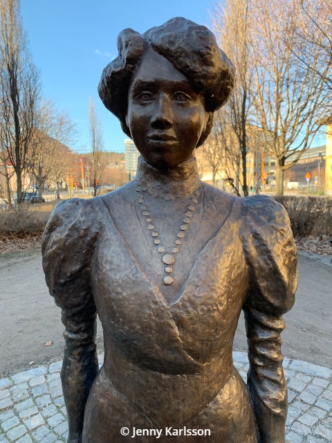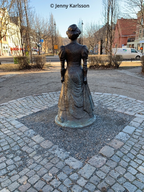 Skulpturen ”Frida” av Camilla Bergman (1954-) är rest till minne av författarinnan, feministen och målaren Frida Stéenhoff (1865-1945).