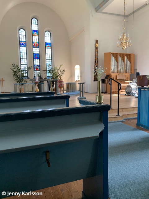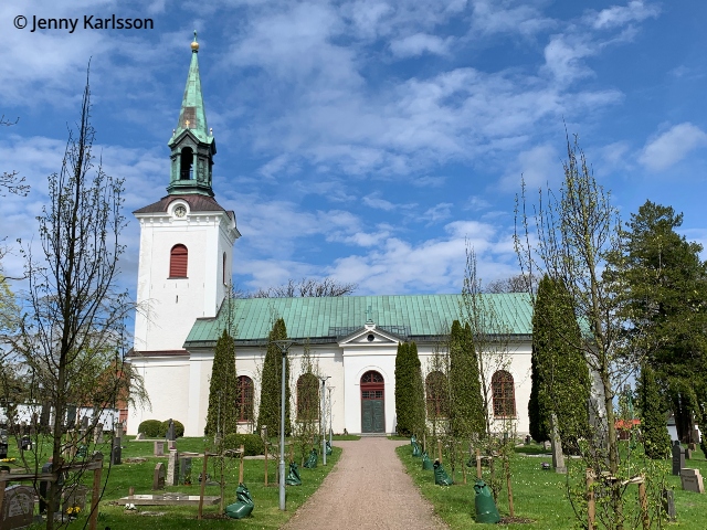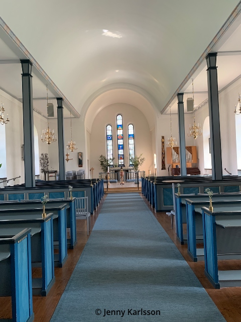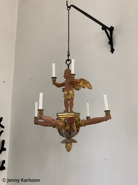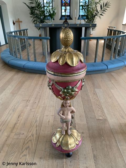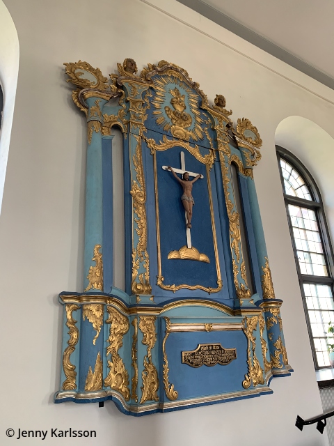 Altartavlan från 1658 skänktes av friherrinnan Catarina Charlotta Falkenberg.