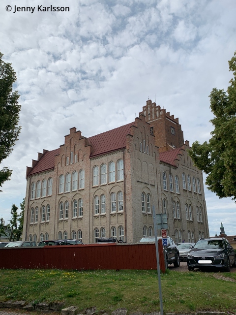 Skolhuset byggs ut för Vadstena Elementarläroverk 1877 efter ritningar av F. B. Oppman och J. F. Åbom, med gymnastiksal i kyrkans bevarade västra travé.