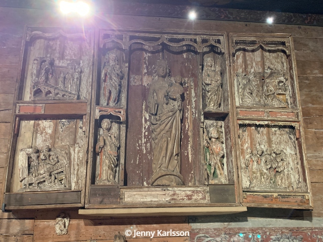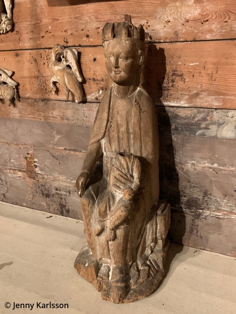 På samma vägg finns ett flertal madonnaskulpturer och andra skulpturer. Skulpturerna är i ek.