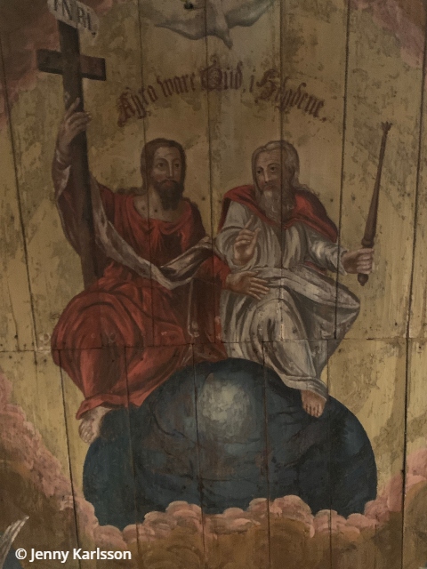 Takmålningarna föreställer treenigheten, himmelsfärden, uppståndelsen och helvetet.