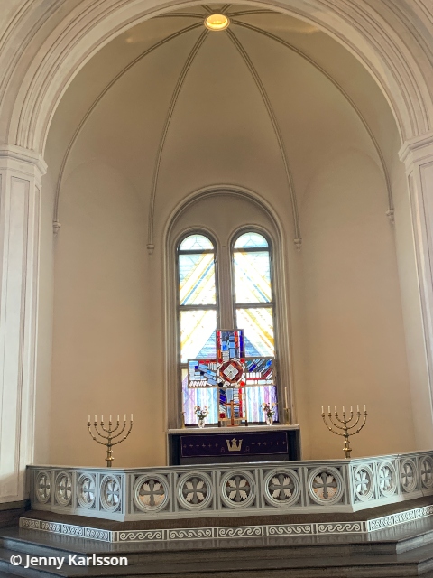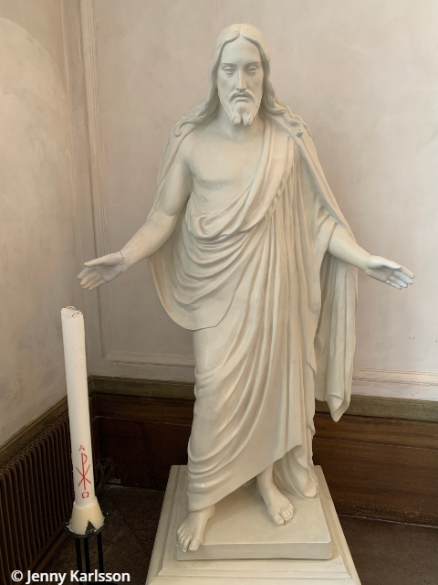 Kyrkorummet domineras av den originella ljuskronan i mittgången. Ljuskronan är tillverkad av 276 bajonetter från gevär av 1861 års modell och väger 500 kg. Med sina tre symboler: krona, bajonetter och kedjor vill den påminna om kungamakten, militärmakten och straff-fångar som en gång byggde Karlsborgs fästning. Bajonettkronan ritades och tillverkades i Tyghuset på Karlsborgs fästning.