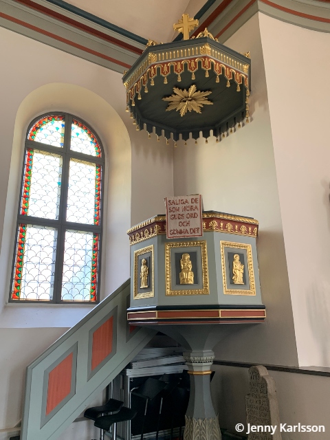 Kyrkans predikstol från 1859, ritad av Ludvig Hawerman, satt från början i långhusets nordöstra hörn. 1938 flyttades den åt norr och fick en ny trappa. Predikstolens skulpturer är utförda av Axel Andersson i Morup.