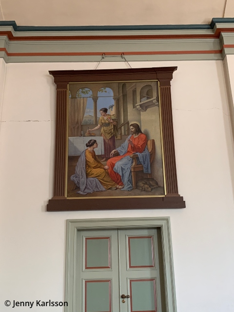 Den stora tavlan som hänger över dörren till sakristian är en kopia av kyrkomålaren Heinrich Hoffmans tavla ”Mästaren på besök hos Maria och Marta”. Tavlan är skänkt av den hjobo som också skänkt glasmålningarna och ljusstakarna.
