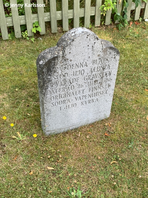 I kyrkan, under predikstolen, förvaras kyrkogårdens allra äldsta gravvård och på dess plats ute på kyrkogården, som idag är Hjo kyrkpark, har Hjo hembygdsförening låtit framställa en kopia.