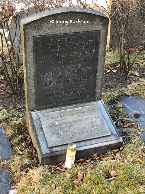 Kristian Bergholtz (1839-1918). Ibland går jag verkligen bet när jag letar information. Gällande Kristian Bergholtz så får jag faktiskt mer eller mindre erkänna mig besegrad… Anledningen till att jag besökte och fotade hans gravplats är att det på informationstavlan på Adolf Fredriks kyrkogård över intressanta gravar så står klockgjutarsläkten Bergholtz med, och på själva gravstenen så står Kristian Bergholtz överst.